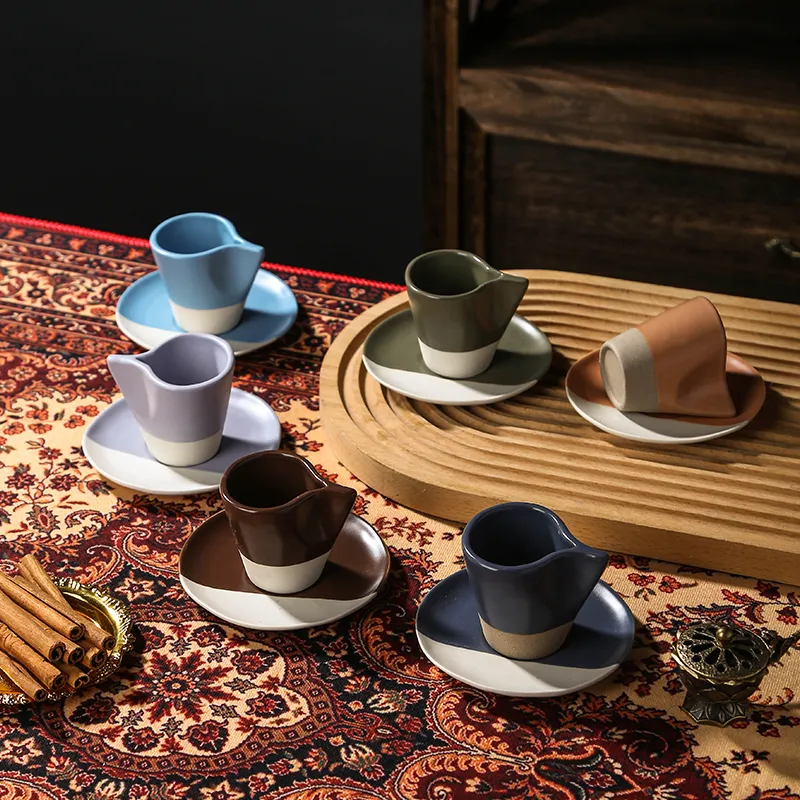 Our custom Arabia coffee cups feature a creative handle and authentic Middle Eastern design in 50 ml ceramic style, ideal for cafés, hotels, cultural events, and bulk OEM orders with customizable logos and patterns.