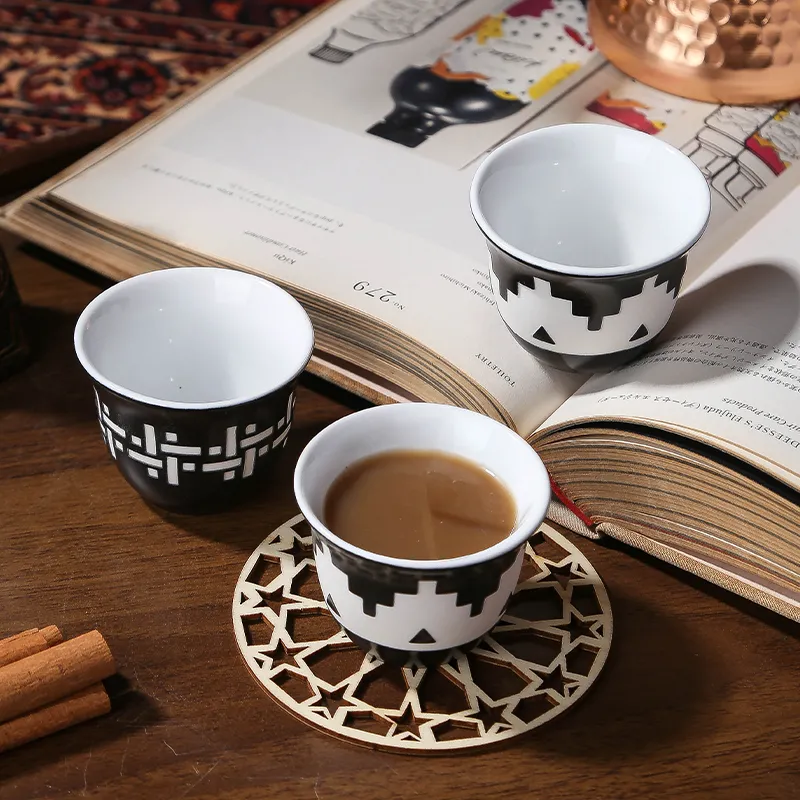 Our custom coffee cup in arabic features a hand-made pattern design on high-quality ceramic with an authentic Arabic aesthetic, ideal for serving traditional Arabic coffee, cafés, hotels, cultural gifting, and bulk OEM customization.