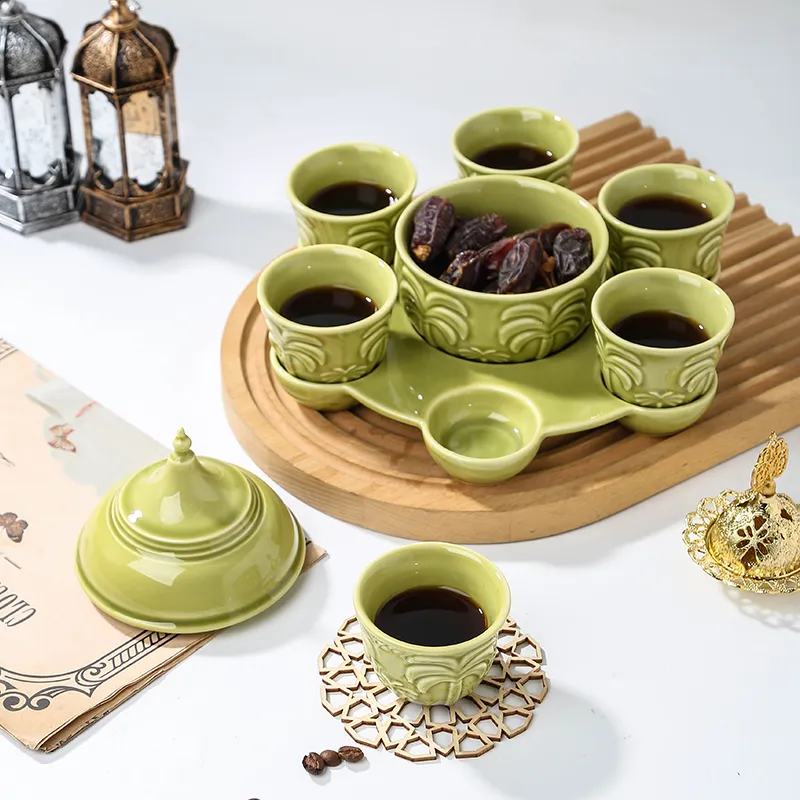 A central lidded jujube bowl with 6 integrated coffee cups, combining serving, storage, and presentation in a single elegant structure.